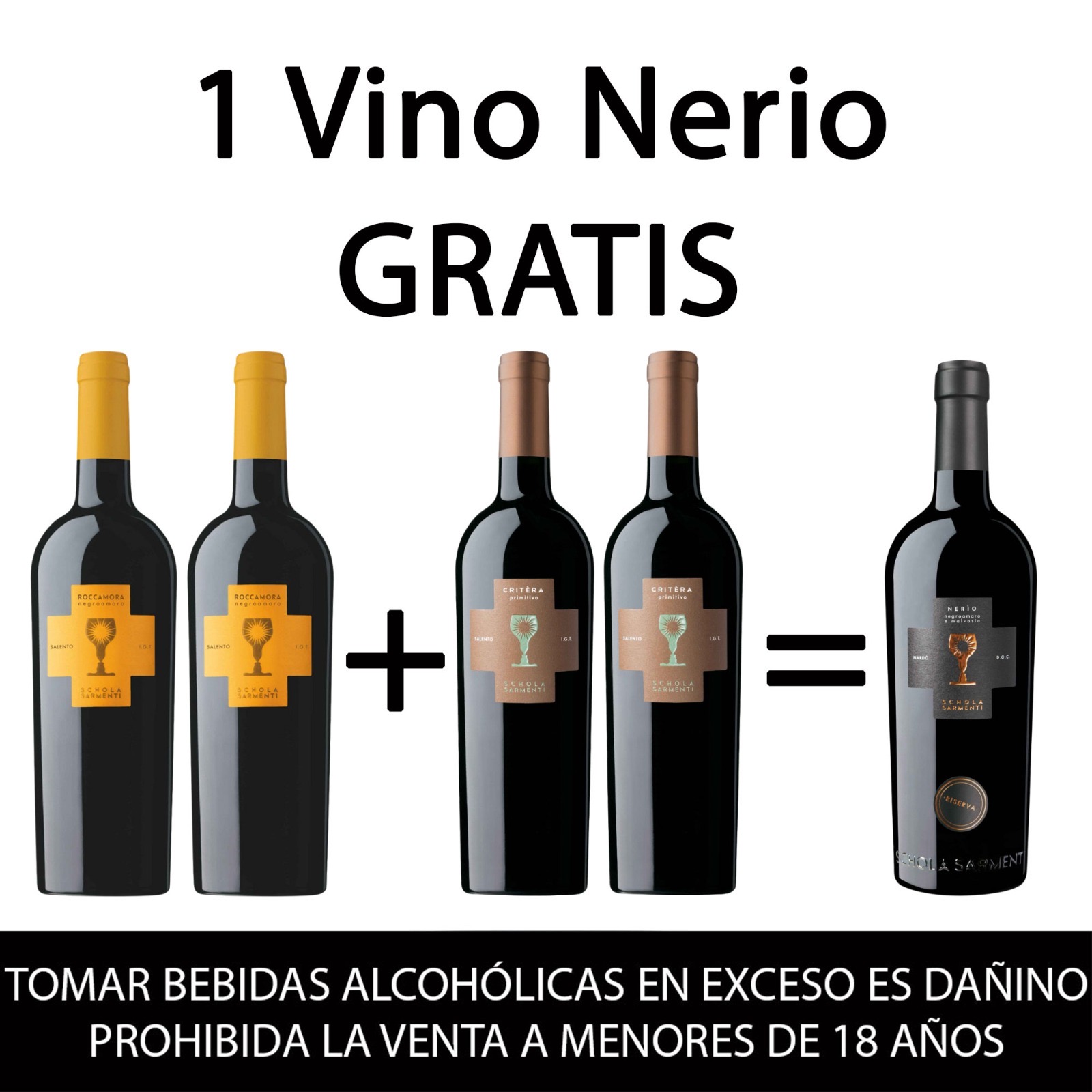 GRATIS 1 botella de Nerio Reserva, Ganador de Múltiples Premios, Nardo DOC, por la compra de 2 botellas de Primitivo, Critera, Salento IGT, más 2 botellas de Negroamaro Roccamora, Salento IGT. Todos ellos producidos por Schola Sarmentii, Italia. Cada una de 750ml. NO SE PUEDE COMBINAR CON OTRAS OFERTAS.